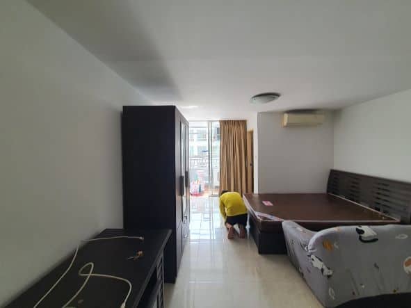 จากสภาพเดิมของห้องลูกค้านั้น เป็นห้องที่ติดวอลเปเปอร์มา จากรูปจะเห็นได้เลยว่า วอลเปเปอร์เริ่มเสื่อมสภาพ หากปล่อยไว้เเบบนี้ โอกาสในการปล่อยห้องเช่านั้นก็อาจจะดูยากสักนิด ดังนั้นทางเจ้าของจึงอยากที่จะปรับปรุงทาสีใหม่ ทั้งฝ้าและผนังเลย ค่าสีห้องเช่า